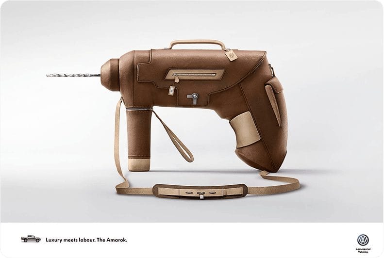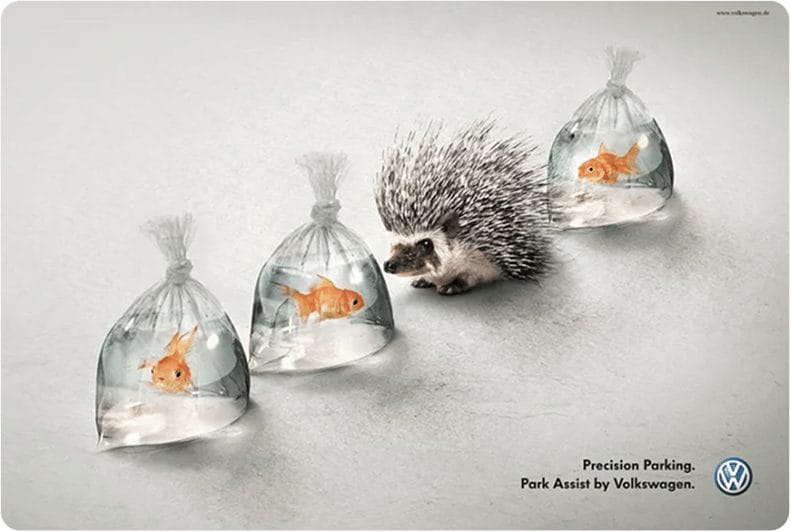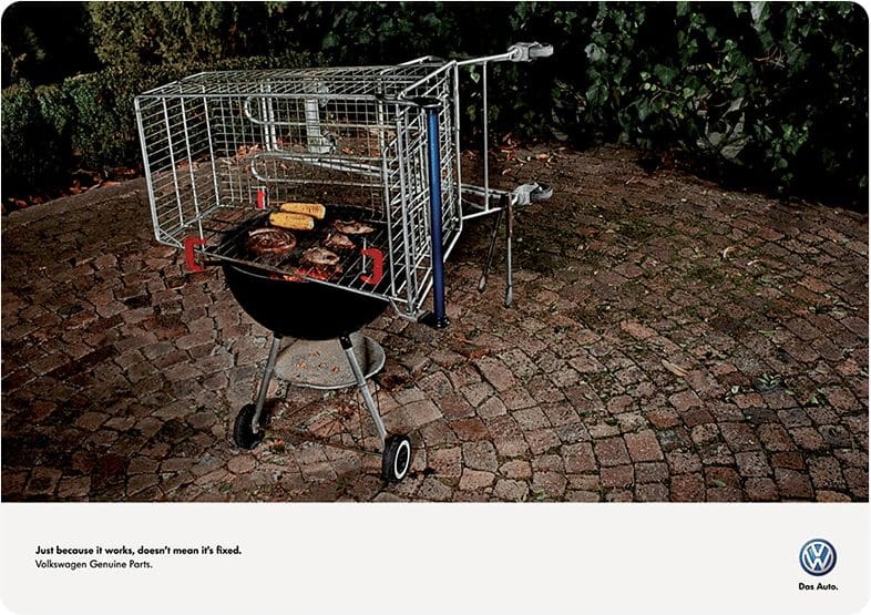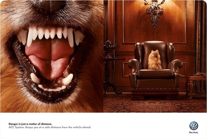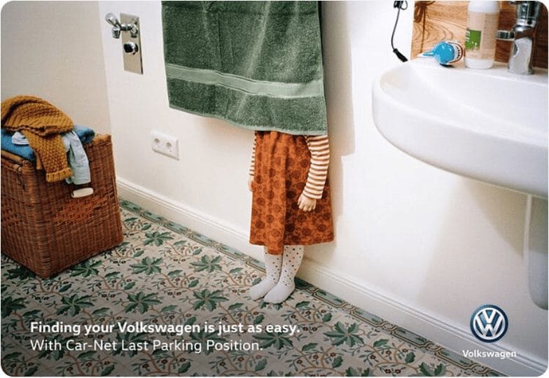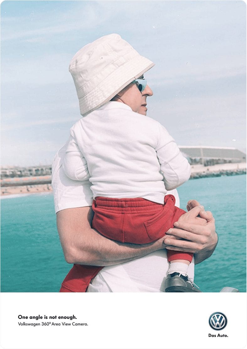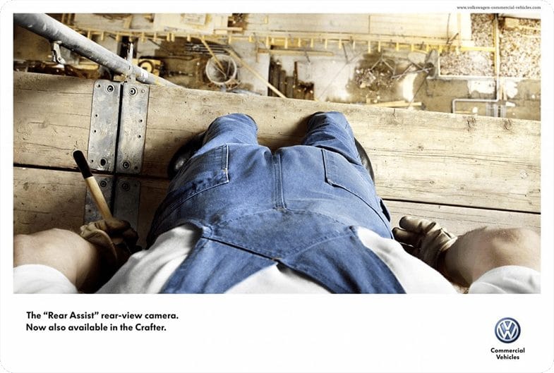 Small copy: “Finding your Volkswagen is just as easy. With Car-Net Last Parking Position.”“Volkswagen Side Assist. Knows what’s coming.”“One angle is not enough. Volkswagen 360° Area View Camera.”“Luxury meets labour. The Amarok.”“Precision Parking. Park Assist by Volkswagen.”“Danger is just a matter of distance. ACC System. Keeps you at a safe distance from the vehicle ahead.”“Small but ferocious. Golf TSI. 103 kW of power from only 1.4 liters of engine.”“The Rear-Assist rear-view camera. Now also available in the Crafter.”“Just because it works, doesn’t mean it’s fixed.Volkswagen Genuine Parts.”