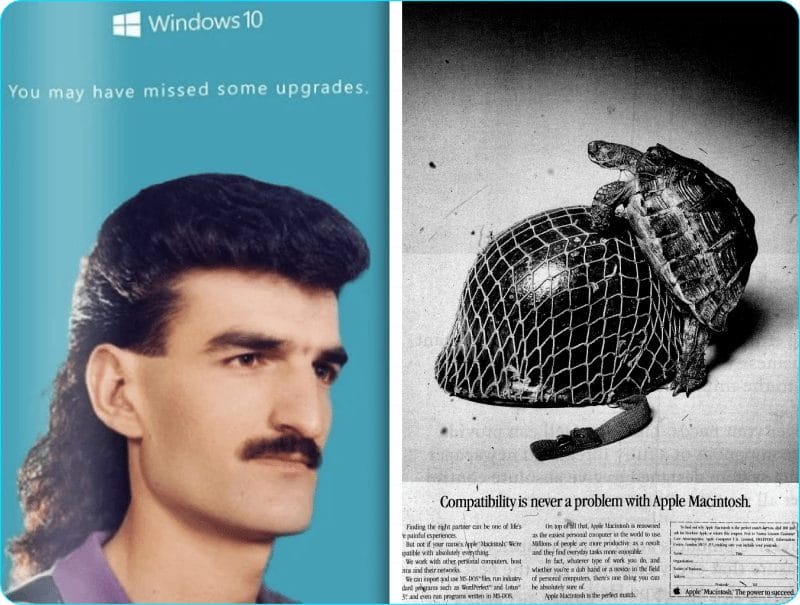 Left ad: “You may have missed some upgrades.”Right ad: “Compatibility is never a problem with Apple Macintosh.”