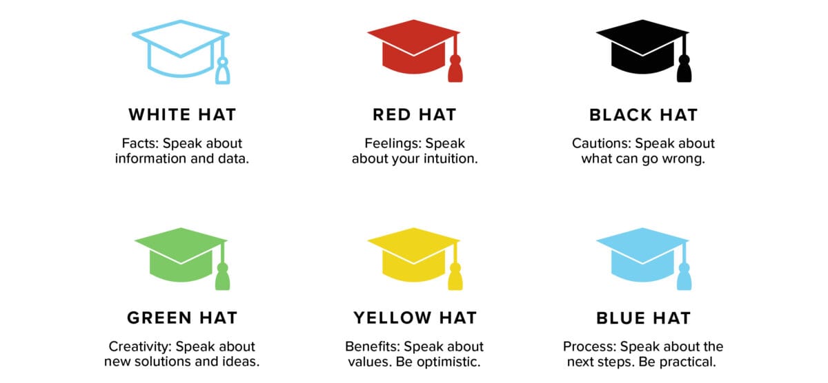We often cling to a bad idea because we’re defending our self-esteem, not the idea. Wear different thinking hats to evaluate ideas objectively.