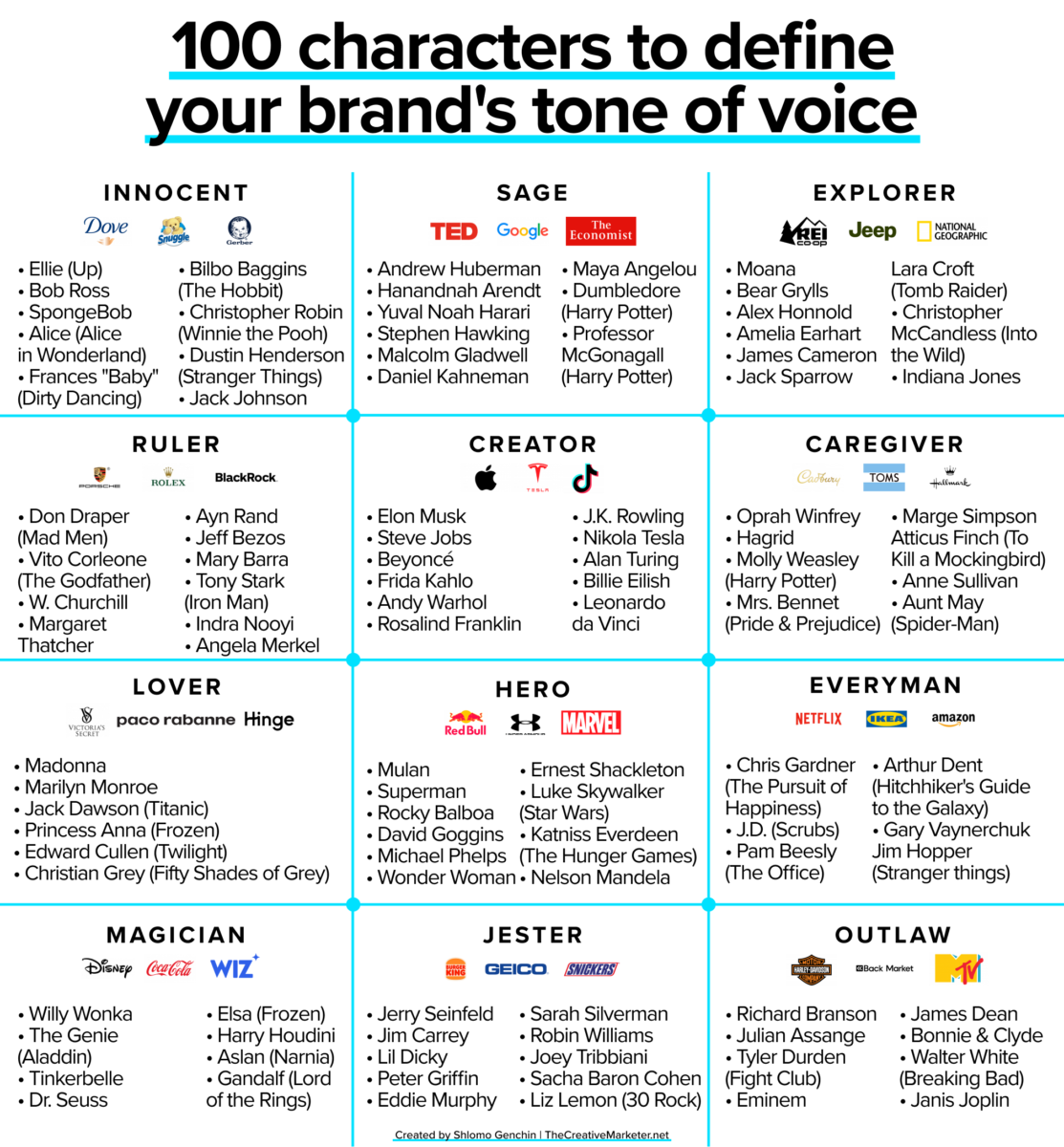 And here are 100 different characters that you can use to define your writing tonality, sorted by brand archetypes.
