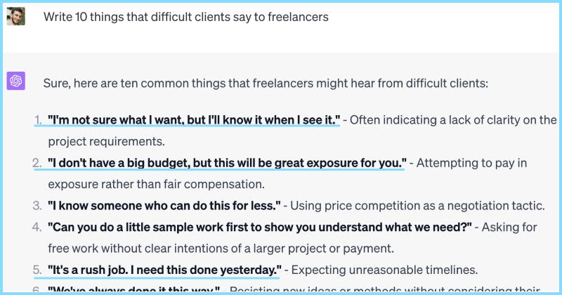 Then, I’ll ask ChatGPT to dive deeper into “difficult clients.”